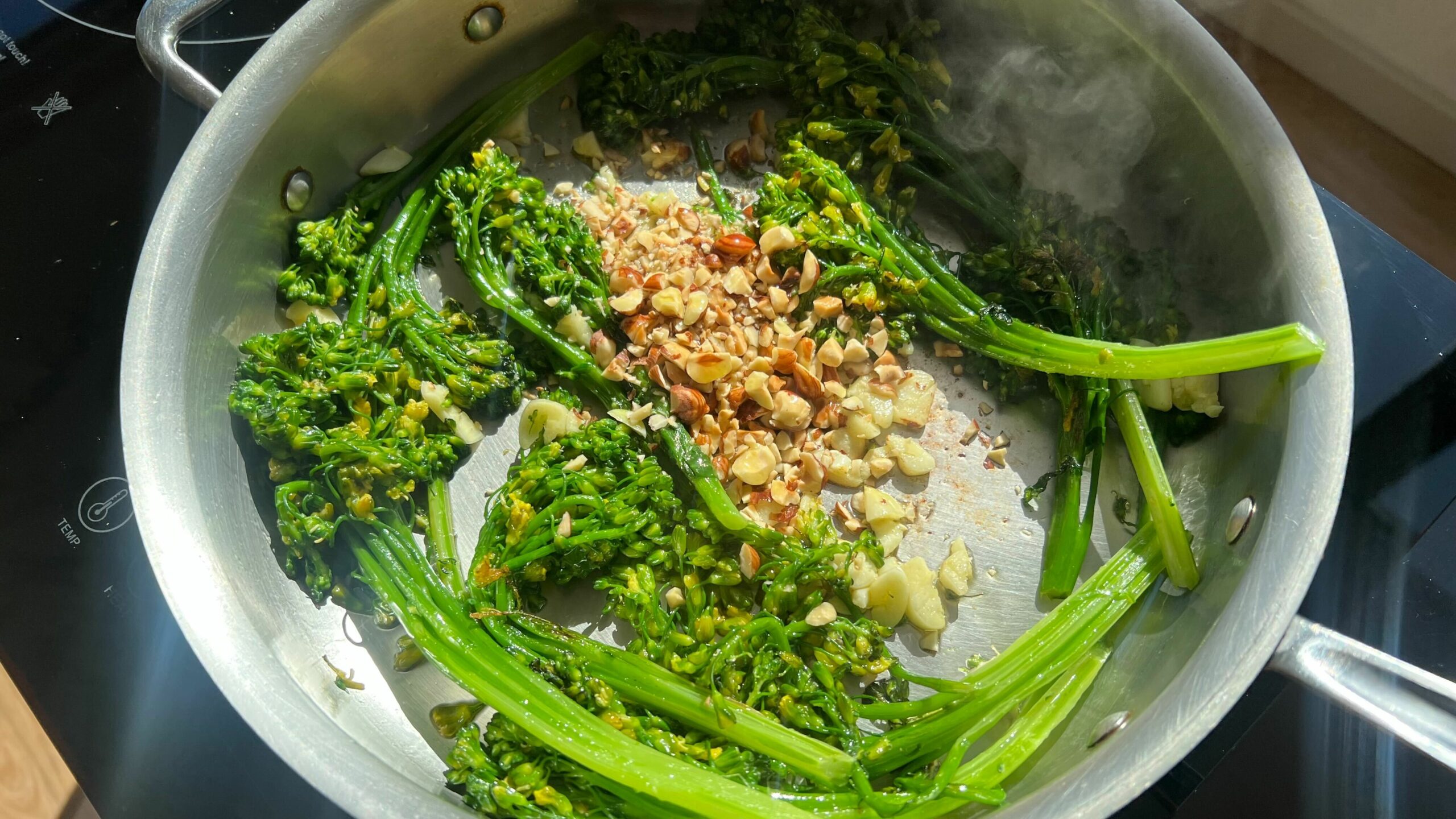 - Drizzle olive oil in the same pan you used to brown the butter and place it on medium. Sear the broccolini on one side, once you flip the broc, add your garlic (add additional olive oil as needed). Once the garlic is tender, add the hazelnuts and drizzle in the brown butter. Remove the pan from the heat, top with Live Moore Finishing Salt, the zest of one lemon, and a squeeze of lemon juice. Serve and enjoy!